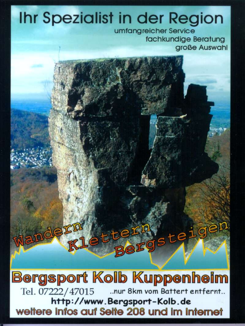 Lange hats gedauert, aber jetzt ist er endlich erschienen: Der neue Bergwacht-Kletterführer für den Battert und den Nordschwarzwald. Ein Team der Bergwacht hat alle Touren neu geklettert und die Routen nach verschiedenen Kriterien bewertet. Die Daten: DIN A5-Format, 225 Seiten, Texte deutsch und französisch, Preis 35,20 DM / 18 EURO